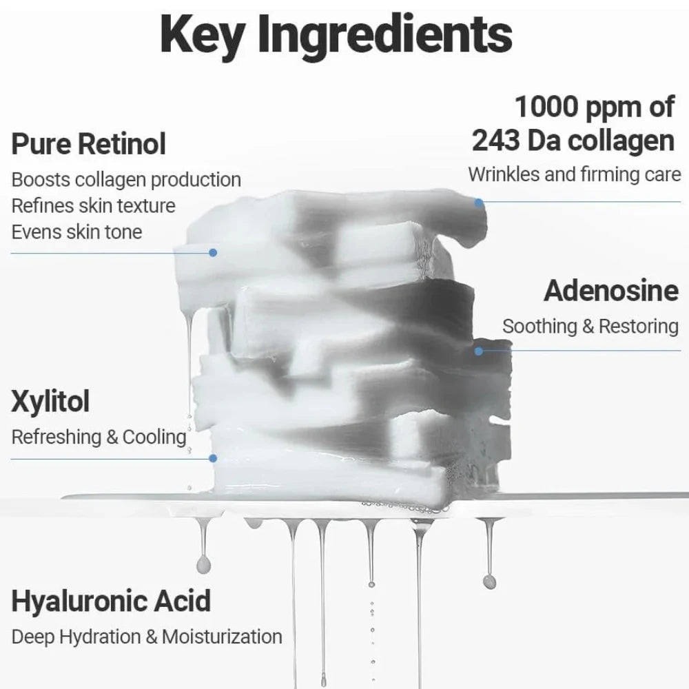 Each stretchy pad is soaked in a well-ageing essence featuring a blend of pure retinol and low molecular weight collagen to soften the look of fine lines, refine texture and boost elasticity. Five plumping layers of hyaluronic acid provide deep hydration while cooling xylitol, the soothing cica derivative madecassoside, and allantoin calm redness and irritation.